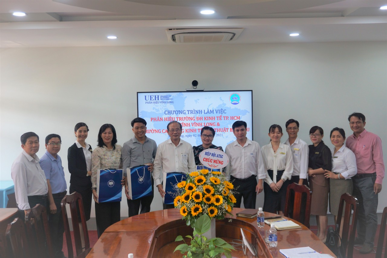 TS. Trần Công Chánh – Chủ tịch Hiệp Hội các Trường CĐ-TC Kinh tế – Kỹ thuật Việt Nam (ATEC), Hiệu trưởng Trường CĐ Kinh tế – Kỹ thuật Bạc Liêu bày tỏ sự vui mừng trước sự phát triển của Phân hiệu Vĩnh Long (trước đây là Trường Cao đẳng Kinh tế – Tài chính tỉnh Vĩnh Long và là thành viên của Hiệp hội). Tiến sĩ gửi lời cảm ơn đến Lãnh đạo Trường Đại học Kinh tế Tp. Hồ Chí Minh đã dành thòi gian làm việc, nhằm thảo luận sâu hơn các vấn đề liên quan đến công tác liên kết trong tổ chức tuyển sinh và đào tạo giữa hai đơn vị. Trên cơ sở những trao đổi công tác tuyển sinh, liên kết đào tạo các lớp tập huấn bồi dưỡng, liện thông đại học Chính quy và VLVH, nghiên cứu khoa học… Trường CĐ Kinh tế – Kỹ thuật Bạc Liêu mong muốn nhận được những ý kiến tư vấn từ UEH nhằm tăng cường sự hợp tác giữa hai đơn vị trong tương lai.