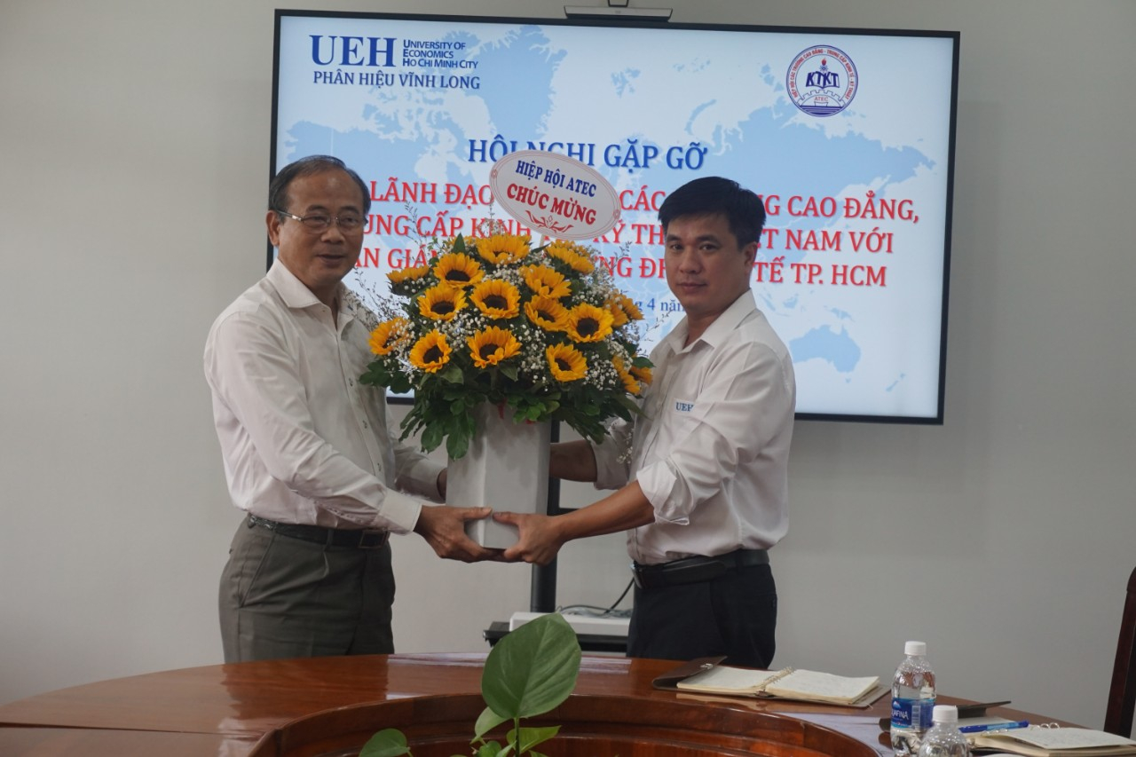 TS. Trần Công Chánh – Chủ tịch Hiệp Hội các Trường CĐ – TC Kinh tế – Kỹ thuật Việt Nam (ATEC), Hiệu trưởng Trường CĐ Kinh tế – Kỹ thuật Bạc Liêu thay mặt Hiệp Hội tặng hoa chúc mừng TS. Bùi Quang Hùng – Phó Hiệu trưởng UEH kiêm Giám đốc Phân hiệu và Chúc mừng Phân hiệu Vĩnh Long